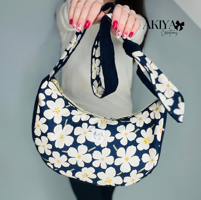 Sac réalisé en velours côtelé bleu marine et popeline de coton motifs floraux