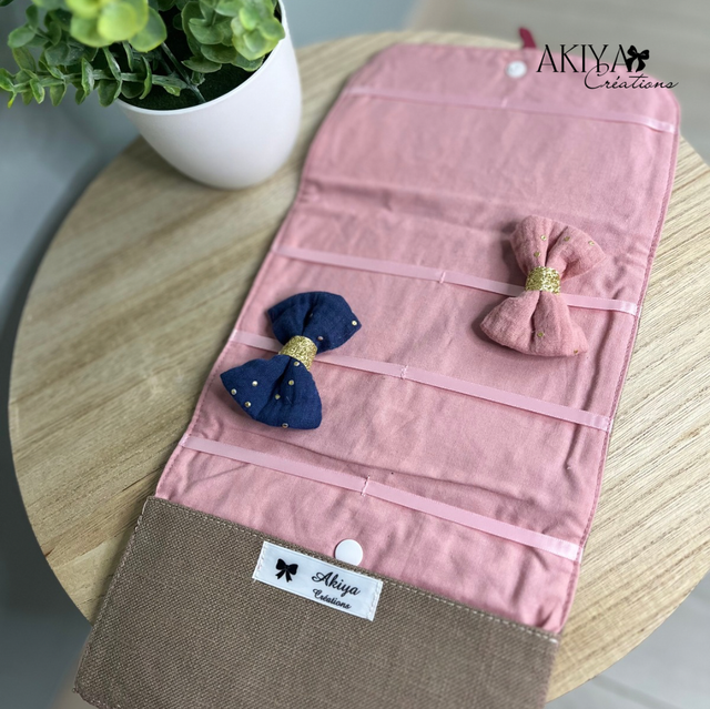 À accrocher au mur ou prête à être emmenée en vacances, vous pourrez y glisser les barrettes grâces aux 4 rubans mais aussi les élastiques avec sa petite poche !!