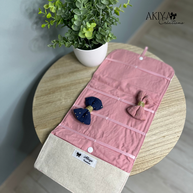 À accrocher au mur ou prête à être emmenée en vacances, vous pourrez y glisser les barrettes grâces aux 4 rubans mais aussi les élastiques avec sa petite poche !!